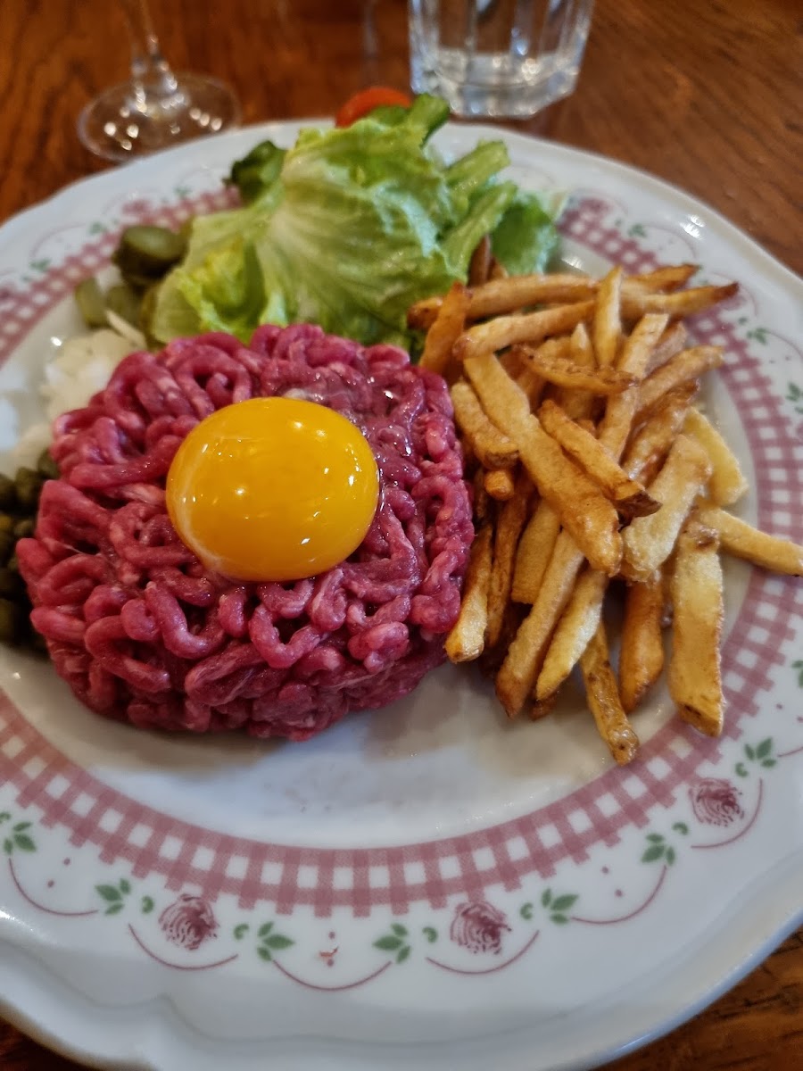 For something heartier, do not miss the restaurant's specialties and signature meats sourced from Aubrac. Indulge in the Pavé de bœuf, perfectly grilled beef served with crispy fries and homemade Béarnaise sauce for only €20. Or, the unique Burger Partie de Campagne unveils layers of flavors, featuring a toasted bun, melted raclette cheese, and a sunny-side-up bio egg — all for €20.